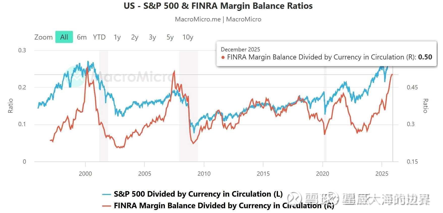 引用一下泽元投资的观点,目前美股保证金余额比率徘徊在0.50左右,几乎与本世纪初互联网泡沫时期美股最高位的2000年3月和次贷危机前夕美股最高位的2007年6月的水平持平。