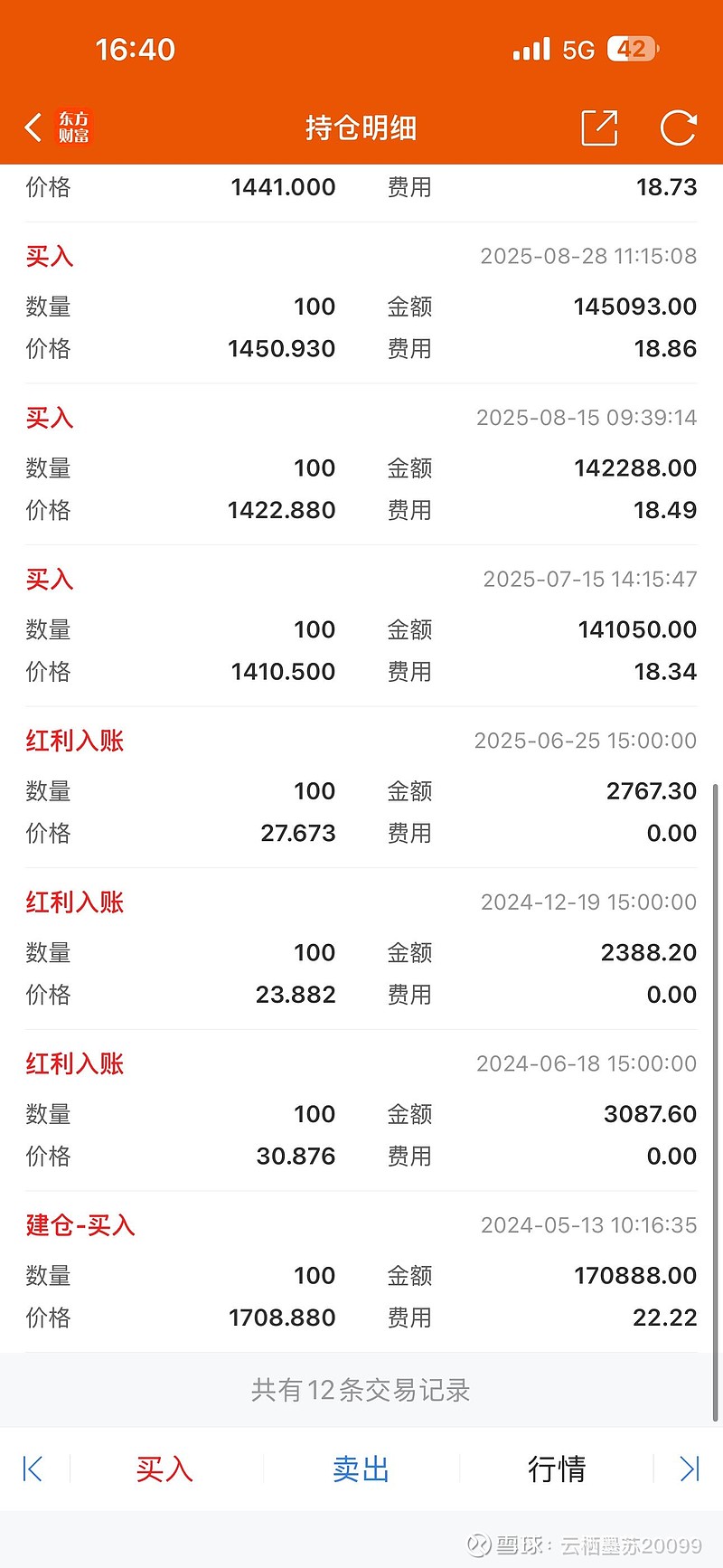 这两年里,我没割肉,反而在下跌中慢慢补仓、靠分红摊薄成本:茅台已经从1708的高位,通过分批低吸把持仓成本降到了1428元,算是慢慢爬出了深坑;但片仔癀和五粮液,至今仍是我持仓里最绿、浮亏最多的两只,还在“山顶站岗”的煎熬里慢慢磨。
