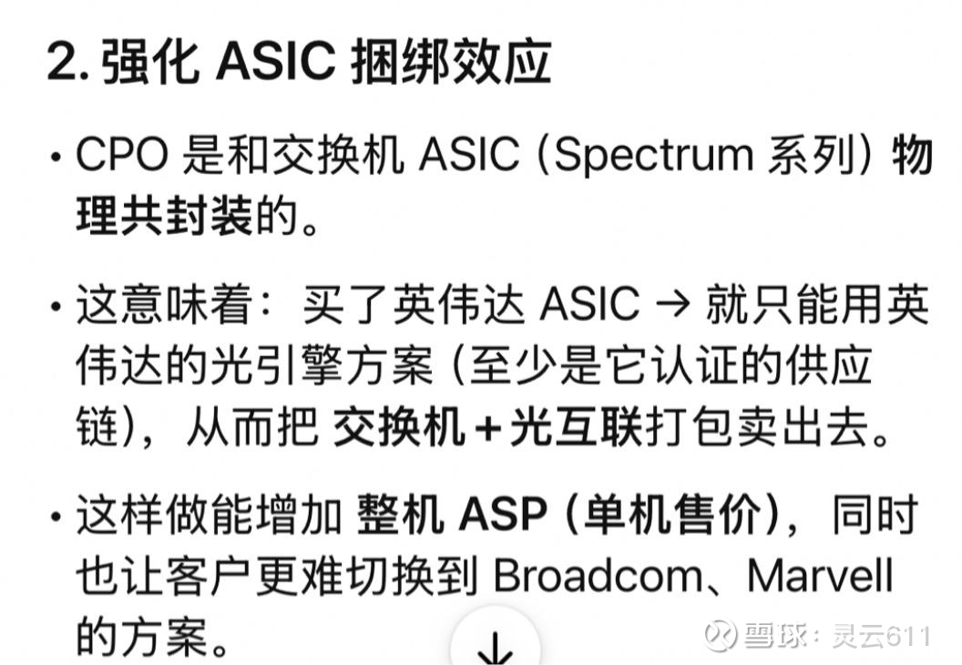$中际旭创(SZ300308)$ $新易盛(SZ300502)$ 又开始传cpo方案的小作文,呵呵。好多人都不明白nv的目的是什么,重点就是图里的那个目的。所以你们觉得云厂商傻吗?这就是为什么xc明确表示,即使27年在3.2t开始导入的时候,现在云厂商都还纷纷明确要求,要用可插拔。至于cpo方案其他的弊端,都快说吐了。总之就是好坏参半,但从长远战略角度来看,坏处大于好处,所以你是云厂商你怎么选?放着一个极度成熟的方案不用,在意那点儿占总成本才5-7%的光模块,换一套全部被nv绑定的生态?想多了,非蠢即坏,拭目以待。