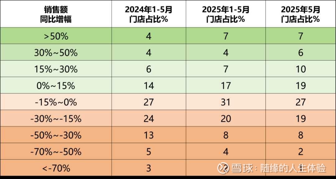 根据中康的统计调研,相较于去年1-5月,35%的门店实现了同比正增长,31%的门店出现微弱下滑,另外1/3的门店跌幅超过15%。在存量竞争的市场中,比拼的是门店的综合运营能力和抗风险能力。