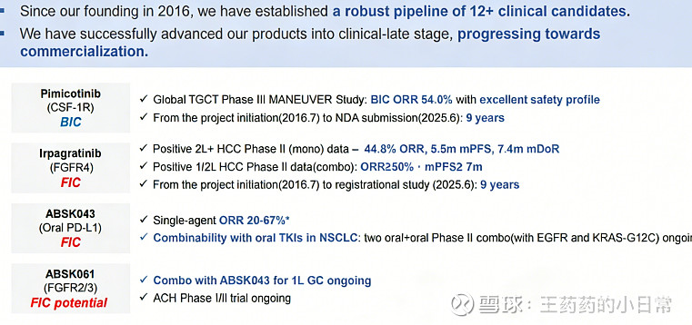 整体来说,为什么会持续看好和誉?和誉从药物设计到临床转化目的性很明确、且临床表现很稳又极具竞争力。从匹米替尼到依帕戈替尼、再到ABSK043等,每款都是FIC或者BIC,商业竞争力很强。