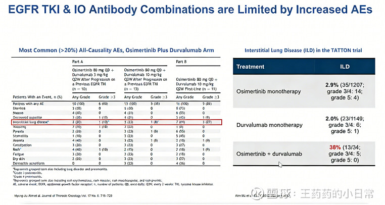 最经典的是EGFR-TKI奥希替尼与PD-(L)1度伐利尤单抗的联合使用:对比看,联合治疗的ILD发生率明显提高,远高于各自单药不足3%的水平。而在此之前,还有一代EGFR-TKI吉非替尼联合度伐利尤单抗的联合试验,疗效增益不明显,且35%患者转氨酶升高至停药,毒副反应更高。这一系列临床上的安全性问题直接给EGFR-TKI+IO这个策略否定了。