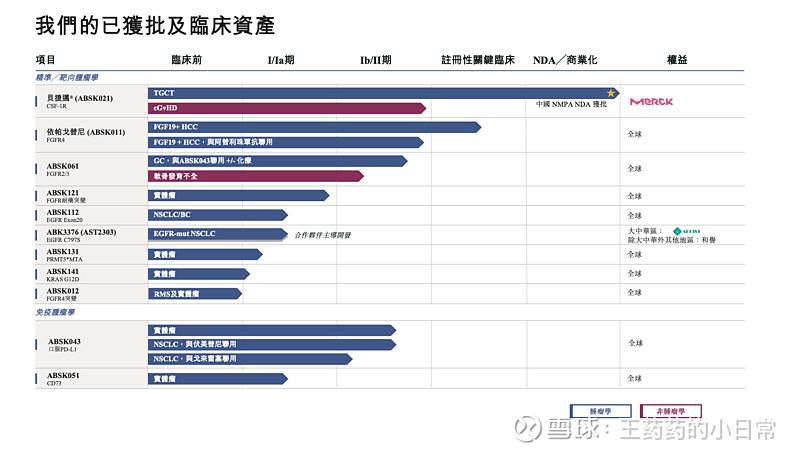 10个处于临床开发阶段的管线,既有注册临床阶段的FGFR4抑制剂ABSK011,也有2期阶段的FGFR2/3抑制剂ABSK061、口服PD- L1抑制剂ABSK043,以及更早期的KRAS G12D等一系列资产。