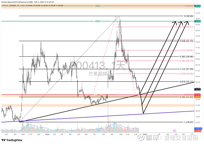 22附近的支撑带+趋势线+斐波那契0.764,超强支撑,大概率反弹的位置,目标位看到前高