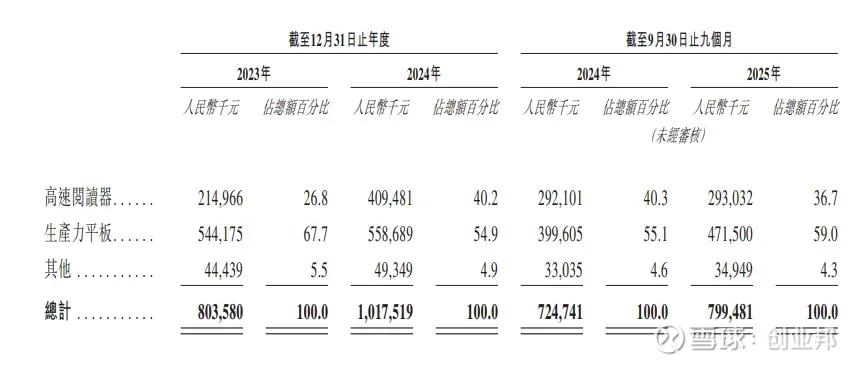 从文石BOOX的产品组合来看,主要包括高速阅读器、生产力平板和其他产品。其中,公司的主要收入来自于生产力平板,2023年、2024年和2025年前三季度,收入占比分别为67.7%、54.9%和59%。