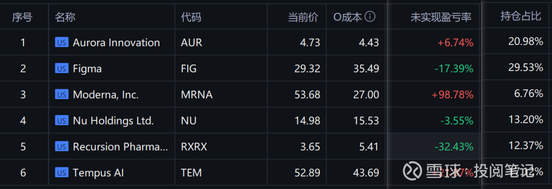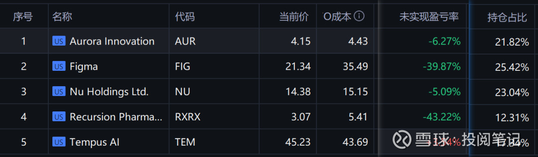对了持仓中除了TEM小幅盈利外,其余公司全部亏损,如果不是昨晚的上涨,所有持仓均面临亏损,值得注意的是FIG和RXRX两个公司的股价均在本周创历史新低,不过我还是不动,关于FIG的观点在28期实盘说的差不多了,对于RXRX这个公司:利用人工智能研发新药,目前来看该公司研发进展很不错,只是该公司年初换了一个新CEO,是内部提拔了上来的,换了新的CEO那么后面公司的管理层大概率会调换。