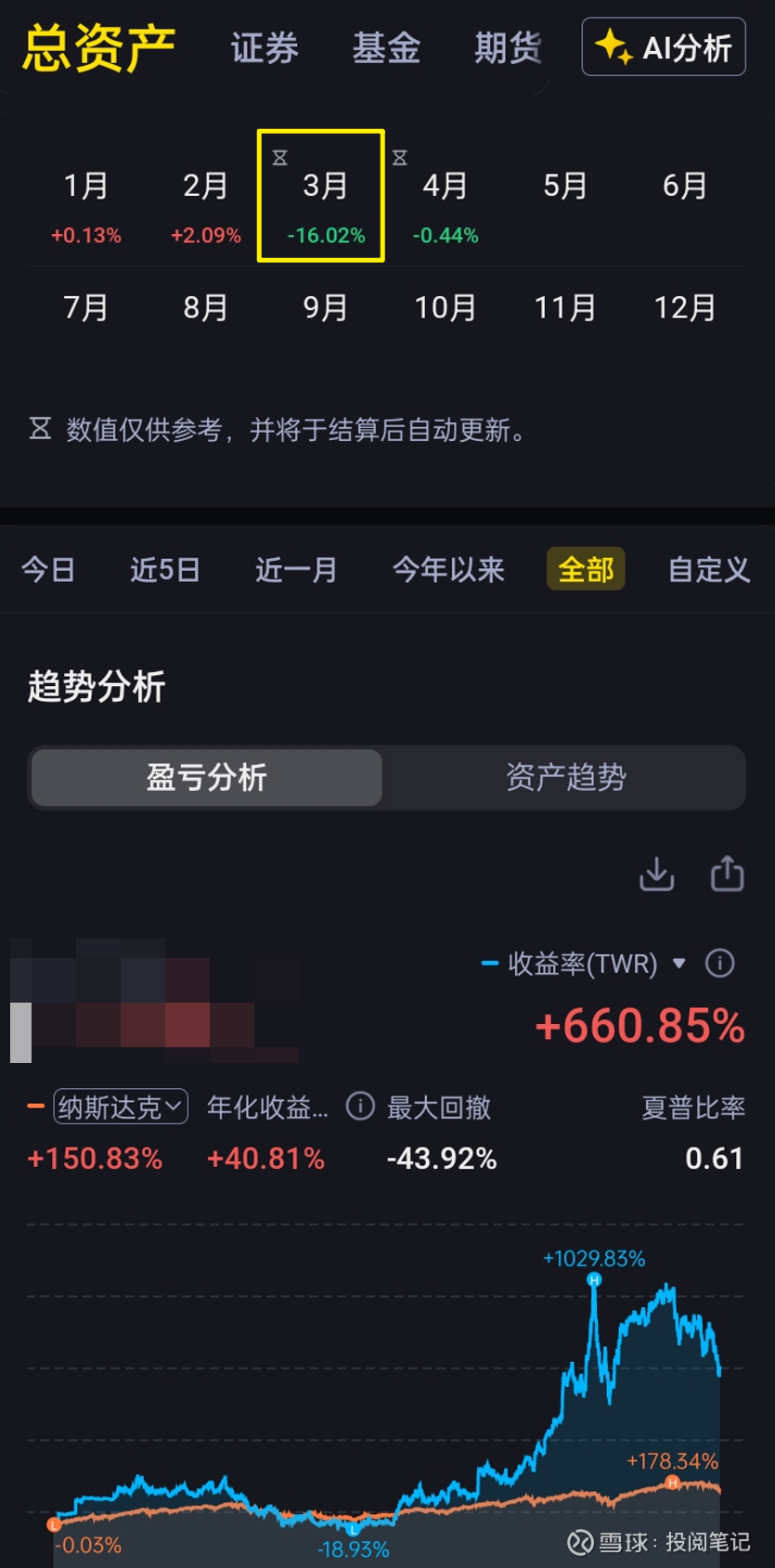 如上图所示,目前账户总收益来到了+660.85%,收益率相比大幅下降,上次是+822.13%,这是总的账户收益率,同时可以看到3月账户-16.02%,简单点说就是亏麻了。
