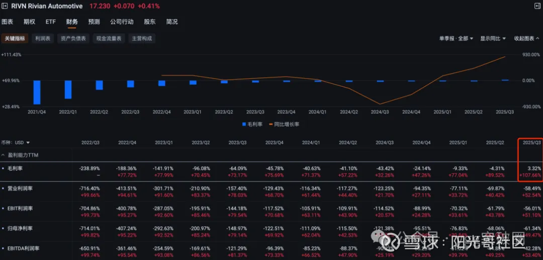 rivn最近开始有启动迹象,我们来看一下这家公司最近有什么样的变化,我们还是先从财务方面入手,毛利25q3目前开始转正为3.32%,这是一个好的迹象,之前毛利一直为负,从21年上市到现在是首次毛利转正。但ebitda利润率还未转正,还需要时间验证收入的持续性。