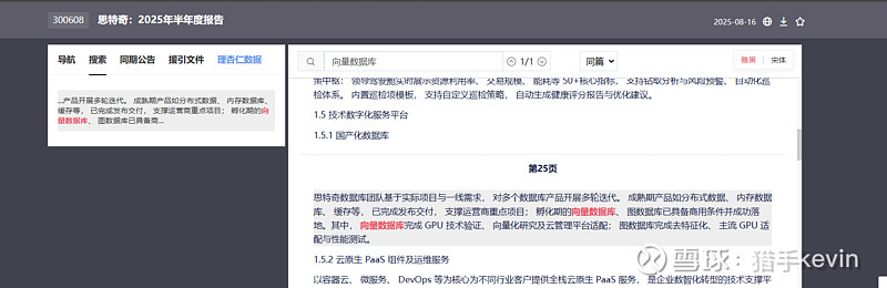 $思特奇(SZ300608)$ 华为向量算力,思特奇数据库团队基于实际项目与一线需求, 对多个数据库产品开展多轮迭代。 成熟期产品如分布式数据、 内存数据库、 缓存等, 已完成发布交付, 支撑运营商重点项目; 孵化期的向量数据库、 图数据库已具备商用条件并成功落地。其中, 向量数据库完成 GPU 技术验证、 向量化研究及云管理平台适配; 图数据库完成去特征化、 主流 GPU 适配与性能测试。$海量数据(SH603138)$ $星环科技-U(SH688031)$