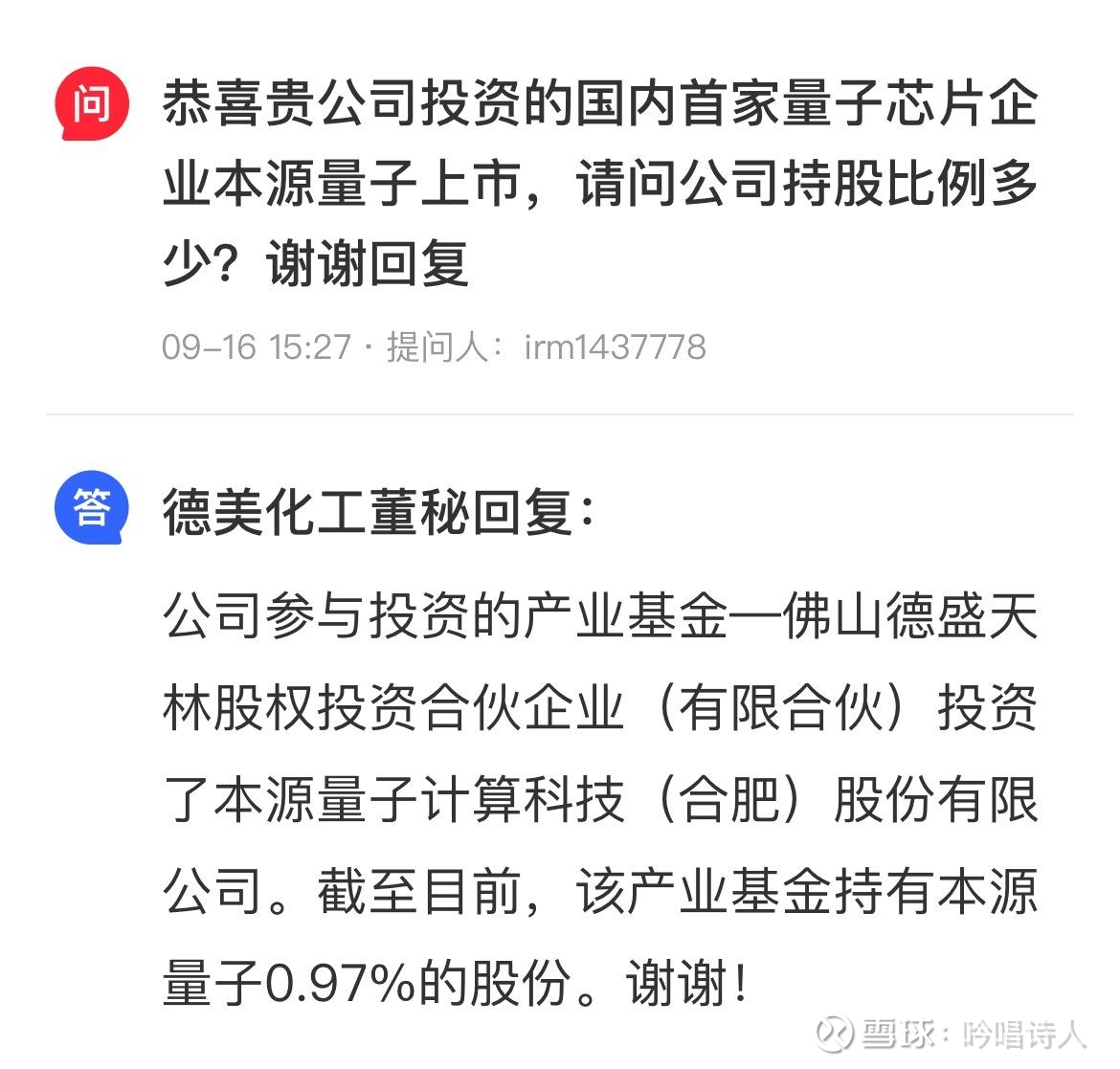$德美化工(SZ002054)$ 十五五量子科技规划+低价+参股本源量子“量子芯片”一哥!!!(本源量子启动IPO)。市场流行的低价+参股行业龙头+IPO 叠加美股 $IonQ(IONQ)$ $D-Wave Quantum(QBTS)$ 等知名量子科技企业都是大涨且创历史新高的,还是很有预期的。十五五的预期还包括海洋经济,可控核聚变,氢能源,脑机接口,6G,商业航天等……国盾量子