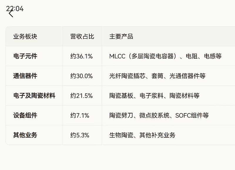 三环2025年营收在90亿左右,市值1000亿。营收结构很全,电子元件占比36%,光通信、陶瓷基板,还有高速增长的SOFC。