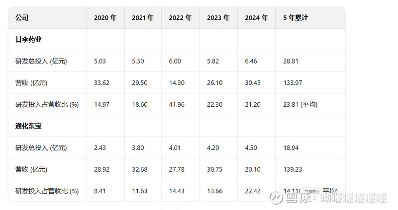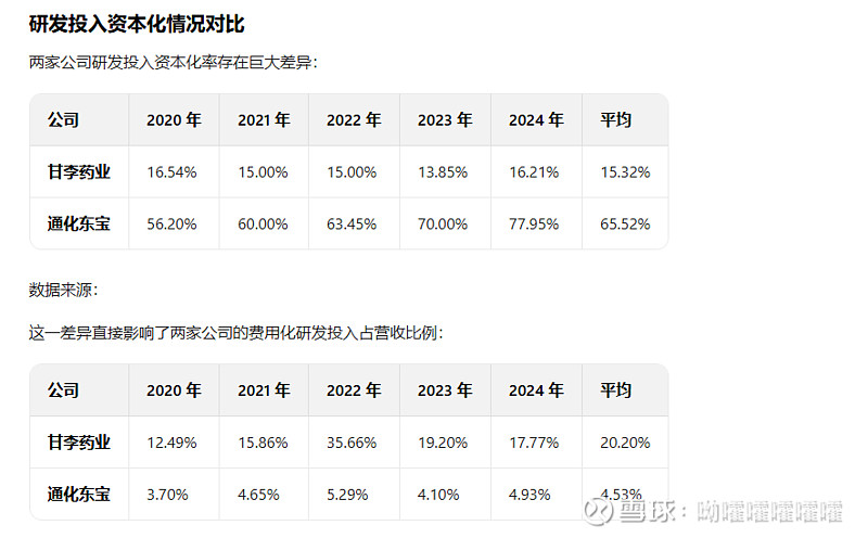 $甘李药业(SH603087)$ 最近 5 年 (2020-2024),甘李药业和通化东宝在研发投入上呈现显著差异。甘李药业研发投入规模和占比均明显高于通化东宝,2020-2024 年累计研发投入 28.81 亿元,是通化东宝 (18.94 亿元) 的 1.52 倍;平均研发投入占营收比例为 23.81%,比通化东宝 (14.11%) 高出近 10 个百分点。此外,两家公司在研发投入资本化策略上差异巨大,甘李药业资本化率仅 15% 左右,而通化东宝高达 60%-78%,导致实际费用化研发投入差距进一步扩大。