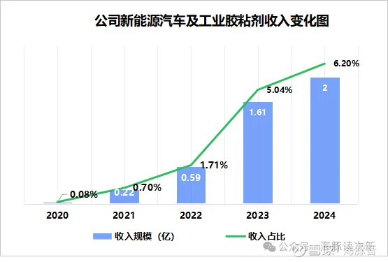 值得一提的是近年来公司以新能源车用胶为切入点进入了高性能工业胶领域,作为近年来公司重点布局的新业务,自2022年以来开始大幅放量,2022-2024年收入分别同比大增167.8%、175%、24%,收入占比也从2022年的1.7%大幅提升至2024年的6.2%。