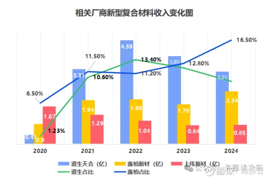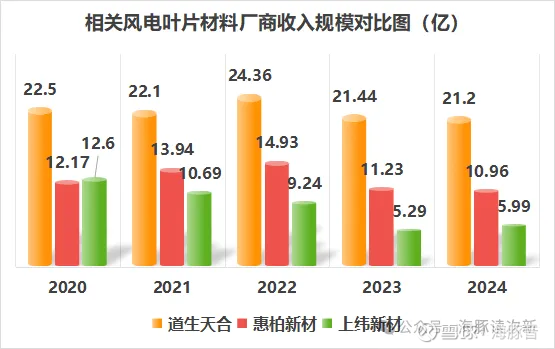 与上纬新材、惠柏新材的新型复合材料主要用于交通运输、体育休闲等其他领域不同,公司新型复合材料树脂应用中风电占比较高,主要客户有重庆风渡、中复碳芯、北玻院、天顺风电、泰山玻纤等,因此公司新型复合材料毛利率较低仅为12-18%左右,略低于上纬新材、惠柏新材28-33%的毛利率水平,与此同时从收入增速看道生新型复合材料也受原材料价格下滑影响相比同业而言甚至出现了下滑,2023、2024年连续2年收入下滑超15%。