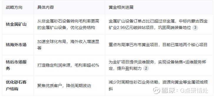 南矿集团目前从IG传统矿山装备服务商通过“装备+服务+资源”的协同战略,逐步切入黄金资源开发领域,实现业务结构的升级拓展。: