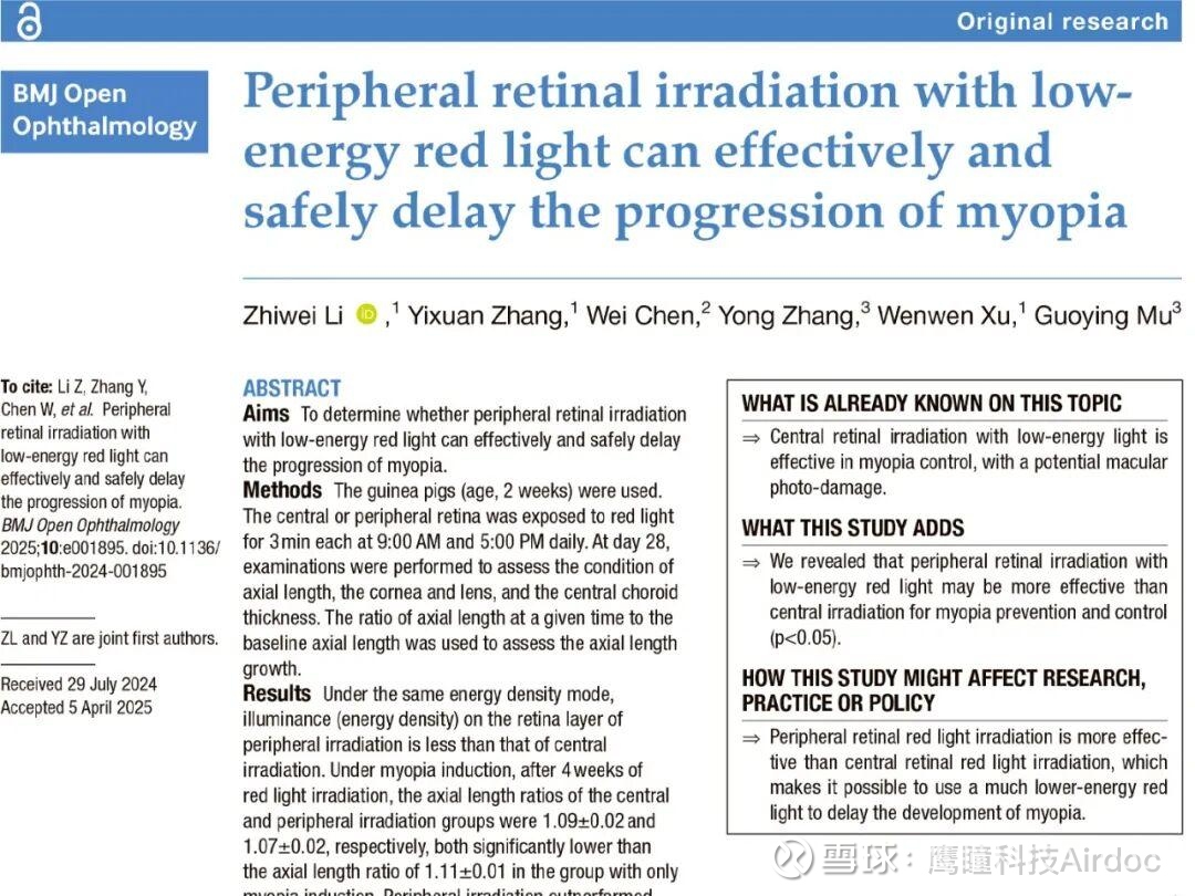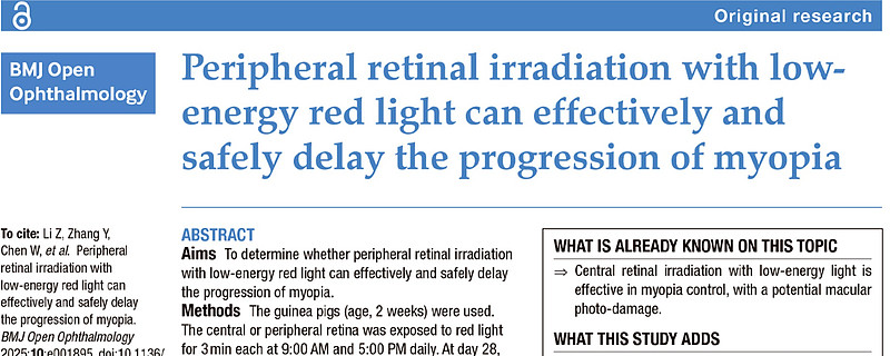 2025年5月,由山东第一医科大学附属省立医院和天津市眼科医院的研究团队在国际顶级期刊BMJ发表了题为《Peripheral retinal irradiation with low-energy red light can effectively and safely delay the progression of myopia》即《低能量红光照射周边视网膜可有效且安全地延缓近视进展》的研究论文(以下简称“本研究”)「1」,为近视预防的最佳靶点选择提供了依据指导。