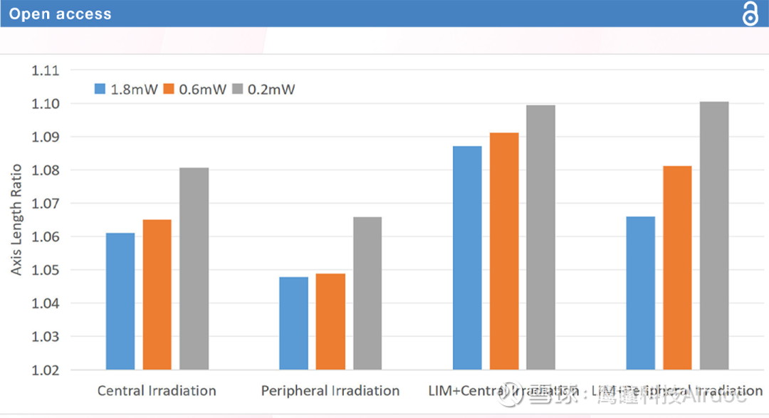 由于既往研究表明,能量密度是影响PBM光疗效果的因素,本研究以1/3为梯度设置1.8、0.6、0.2 mW/cm²三个能量密度,观察能量降低后两种照射模式对眼轴生长的延缓效果及差异。结果显示: 能量密度降低时,眼轴延缓效果随之下降,但各能量密度下周边照射的效果均优于中央照射;在近视诱导状态下,能量密度为0.6mW/cm²的周边照射仍有效,而相同能量密度的中央照射已无效。