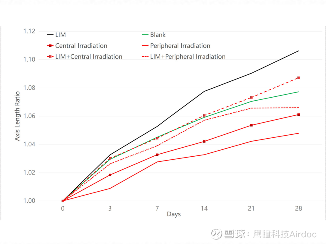 非近视诱导状态:经过4周光照射,中央照射组(n=8)与周边照射组(n=8)的眼轴长度比值分别为1.06±0.01和1.05±0.01,均显著低于空白对照组(n=8)的1.08±0.01。