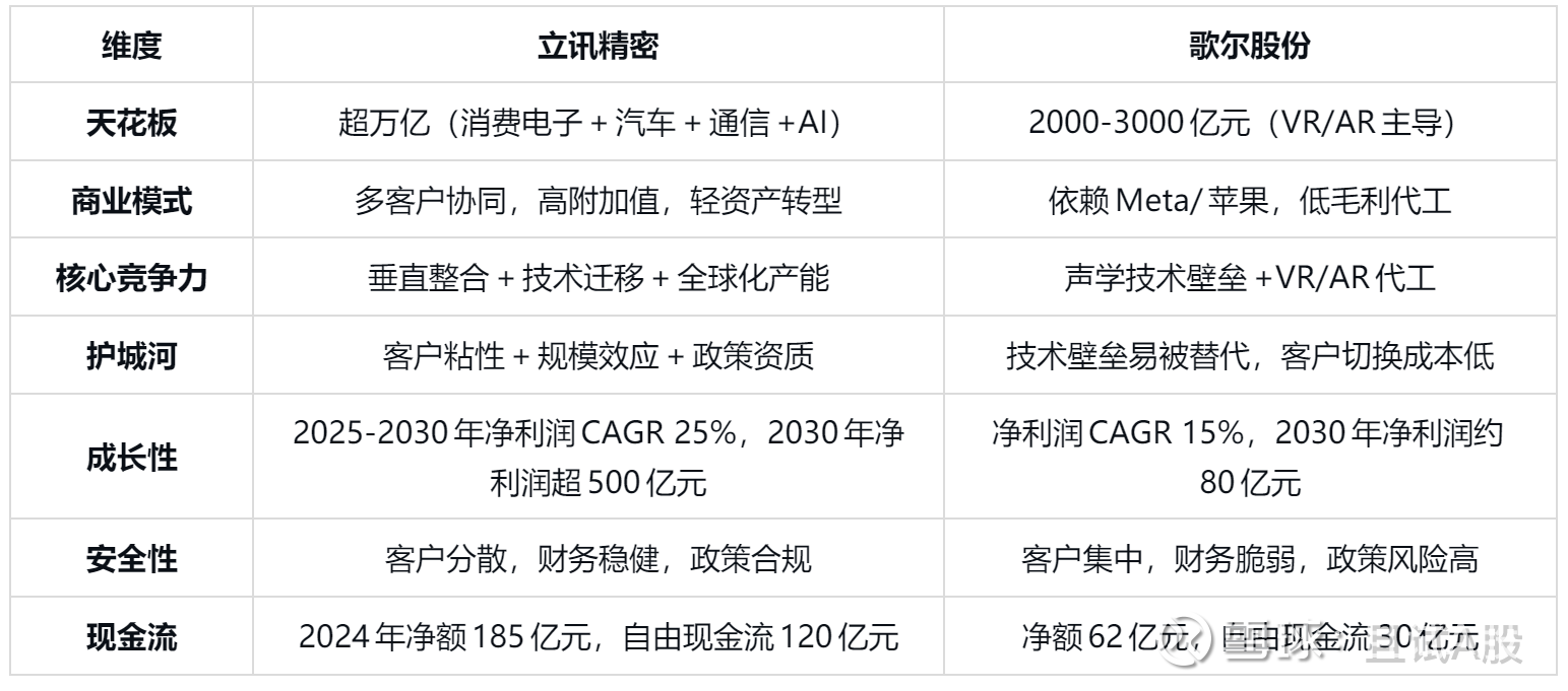 从天花板、商业模式、核心竞争力、护城河、成长性、安全性、现金流七大维度综合分析,立讯精密在万亿市值的争夺中显著领先歌尔股份,且更具长期稳定性。以下是具体对比: