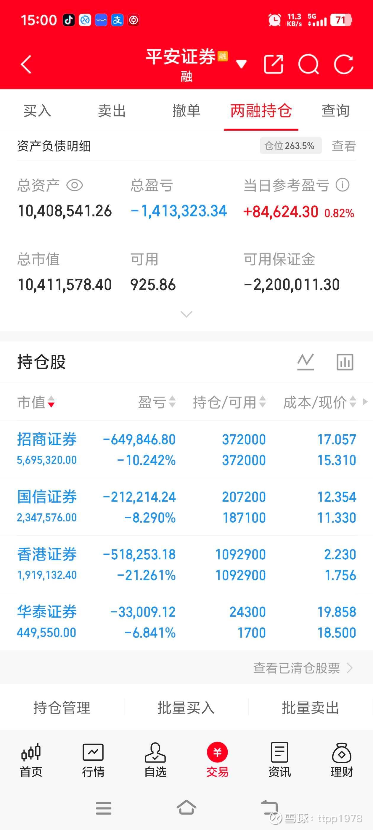 今天是3月27日,周五,今天大盘低开高走,收涨0.63%,量能1.86万亿,涨跌比4337:1033,普涨。我今天盈利8.46万元,约0.82%,跑赢上证0.19%,本月亏损98.8万元,今年累计亏损148.97万元。
