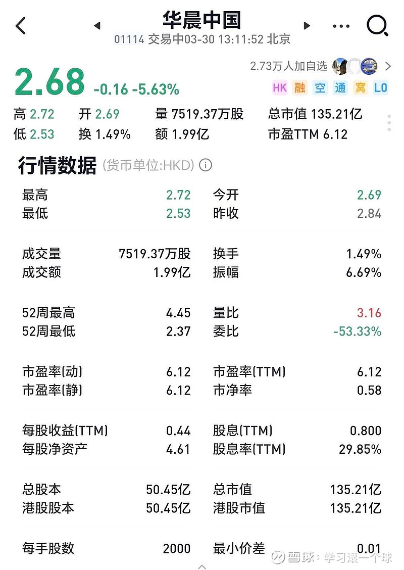 $华晨中国(01114)$今天是2026年3月30日,立一个帖子,华晨中国现在2.7港币,含1.5港币权,除权1.2港币,华晨中国26年大概可以赚0.6港币,27年大概可以赚0.8-1.0港币。今天投资华晨中国,大概2.5年(28年9月)可以靠股息收回投资本金,如果股息复投的话更快。2028年9月30日那天,我们一起来检验