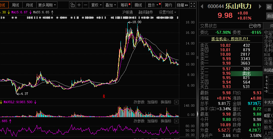 第三步找到股票。这次模拟的是乐山电力。用RSI找到乐山电力在24年1月22日小于20后1月24日以5.99元买入1000股,此后让网格跑起来,不干预到现存。股价从开始的6元到现在的9.98元,期间最低价:4.37元,最高价:18元