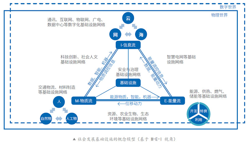 信息流由“云—网—海”表征,包括保障人类开发、收集、存储、处理、应用数据信息的公共服务设施网络,从物质流、能量流获取数据、智能、机器和能量,调控物质流、能量流的开发与运行。