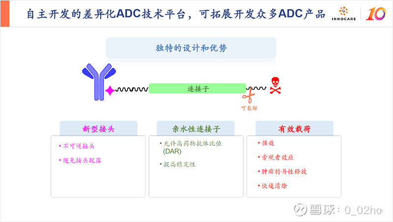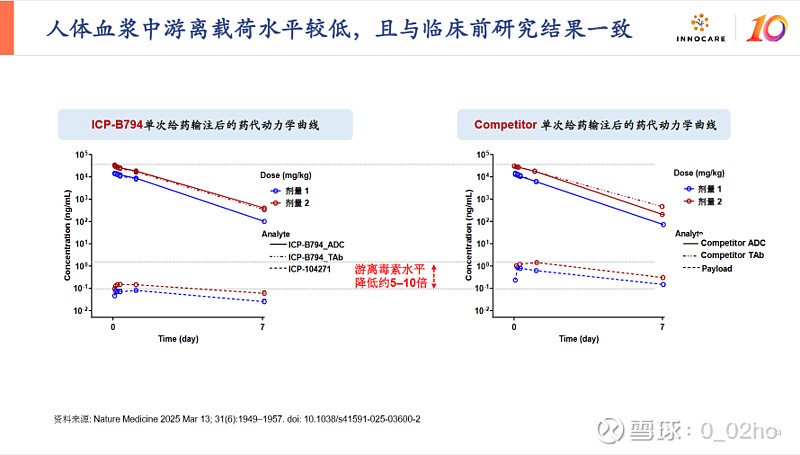 $诺诚健华(09969)$诺诚的ADC技术平台目前来看还是挺强的,有持续输出单抗/双抗/多抗ADC的能力。根据早上业绩交流会披露信息,公司首个进入临床阶段的ADC药物ICP-B794在人体血浆中的游离毒素水平较竞品显著降低约5—10倍,提示该药物在安全性方面具有潜在优势。此外,这次公司还首次披露了另一款靶向CDH17的ADC药物的基础信息,该药物在临床前研究中展现出一定的肿瘤治疗潜力,目前已经提交IND。