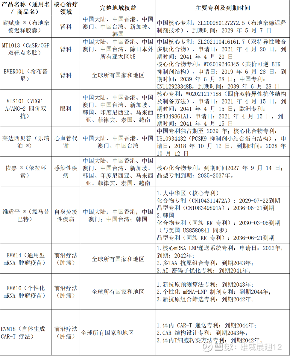 在专利方面,尽管上篇已详细分析短期2-3年内无需过度担心耐赋康仿制药的冲击,但从中长期来看,国内外同赛道新药、生物类似药、仿制药的上市节奏正在加快,特别是到2027年依嘉的核心化合物专利、2029年耐赋康的核心专利、2029年维适平的核心化合物专利,都将面临专利到期或部分专利到期的挑战,尤其是耐赋康的核心专利到期将面临较大的冲击和挑战,后续广大股民对核心产品的专利风险也要重点关注,下表可以方便大家后续做好追踪。