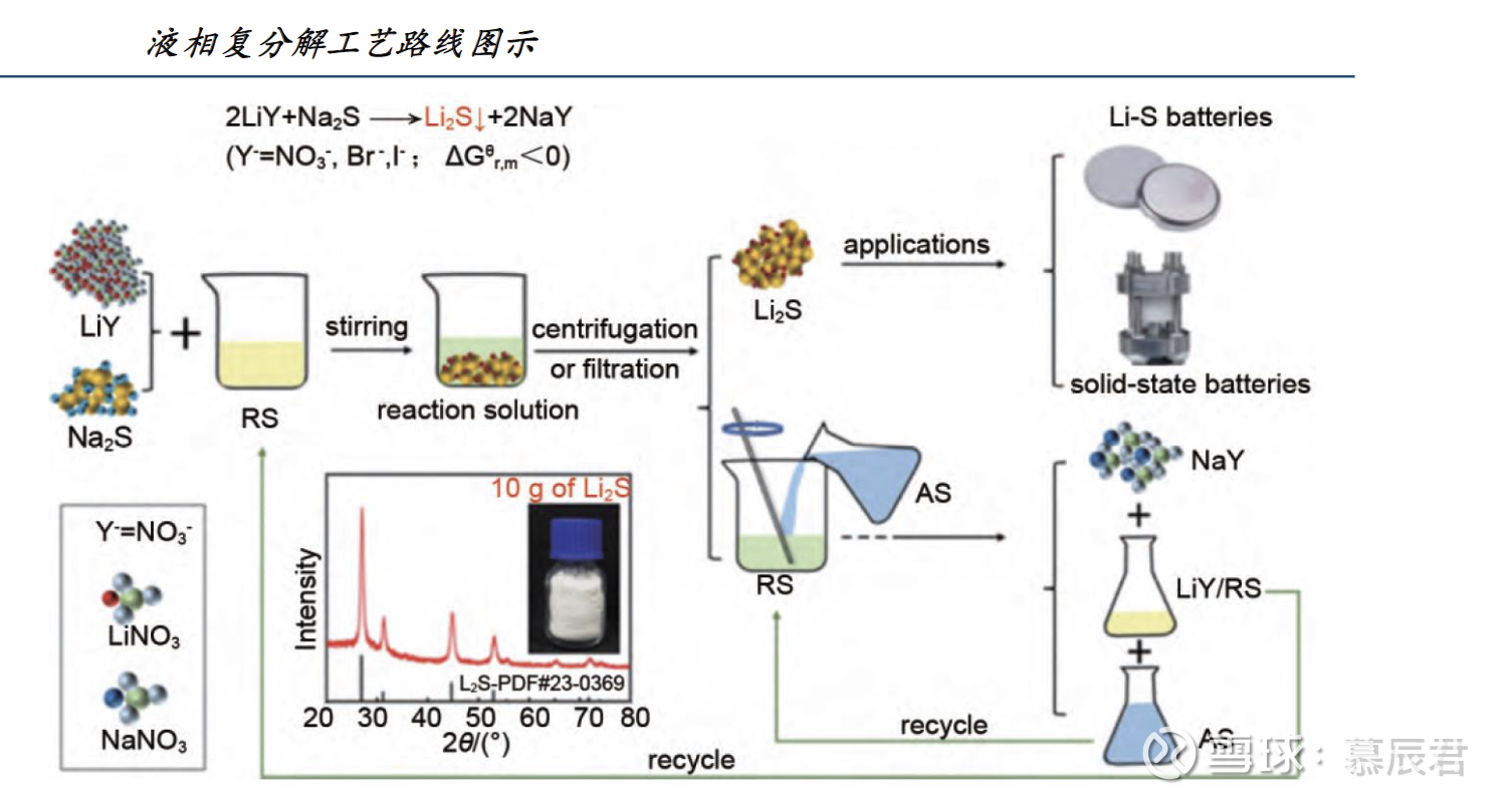 (1)技术:以可溶性锂源、可溶性硫源 为原料,在液体介质(水溶液或非水溶剂) 中发生离子反应,生成Li₂S沉淀,再经过滤、洗涤、真空干燥得到产品。