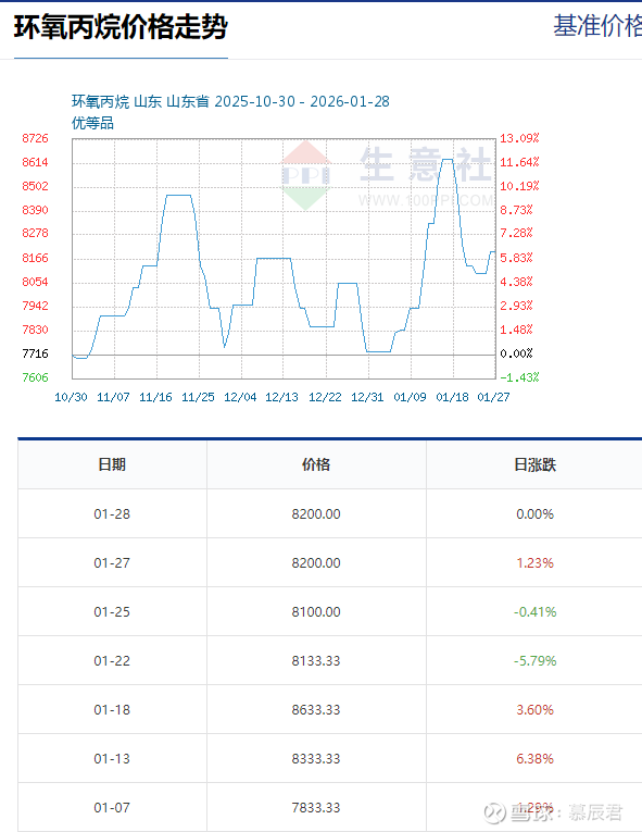 (3)涨价:1月28日,环氧丙烷基准价为8200.00元/吨,与本月初(7733.33元/吨)相比,上涨了6.03%。