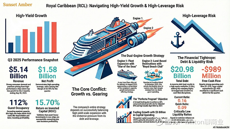 💡 核心冲突:增长 vs. 负债 (Growth vs. Gearing) 这就是RCL目前的战略本质:“Perfecta Program”。 他们正在进行一场豪赌:赌未来的高溢价(双位数ROIC目标)能够覆盖掉现在背负的巨额债务利息。只要载客率维持高位,这个飞轮就能转得飞快;但如果宏观经济下行,高杠杆就是双刃剑。