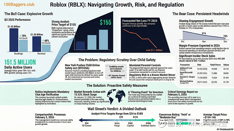 【三大核心驱动】 🔹 监管护城河: 新推出的“强制聊天年龄验证”有效缓解了来自纽约州的压力。市场普遍解读为“利空出尽”,监管风险边际递减。 🔹 华尔街力挺: BMO 重申“跑赢大盘”评级,给出的目标价高达 $155(意味着还有接近翻倍的空间)。 🔹 财报抢筹行情: Q4 财报已定档 2月5日,资金开始在财报前提前吸筹(Run-up)。