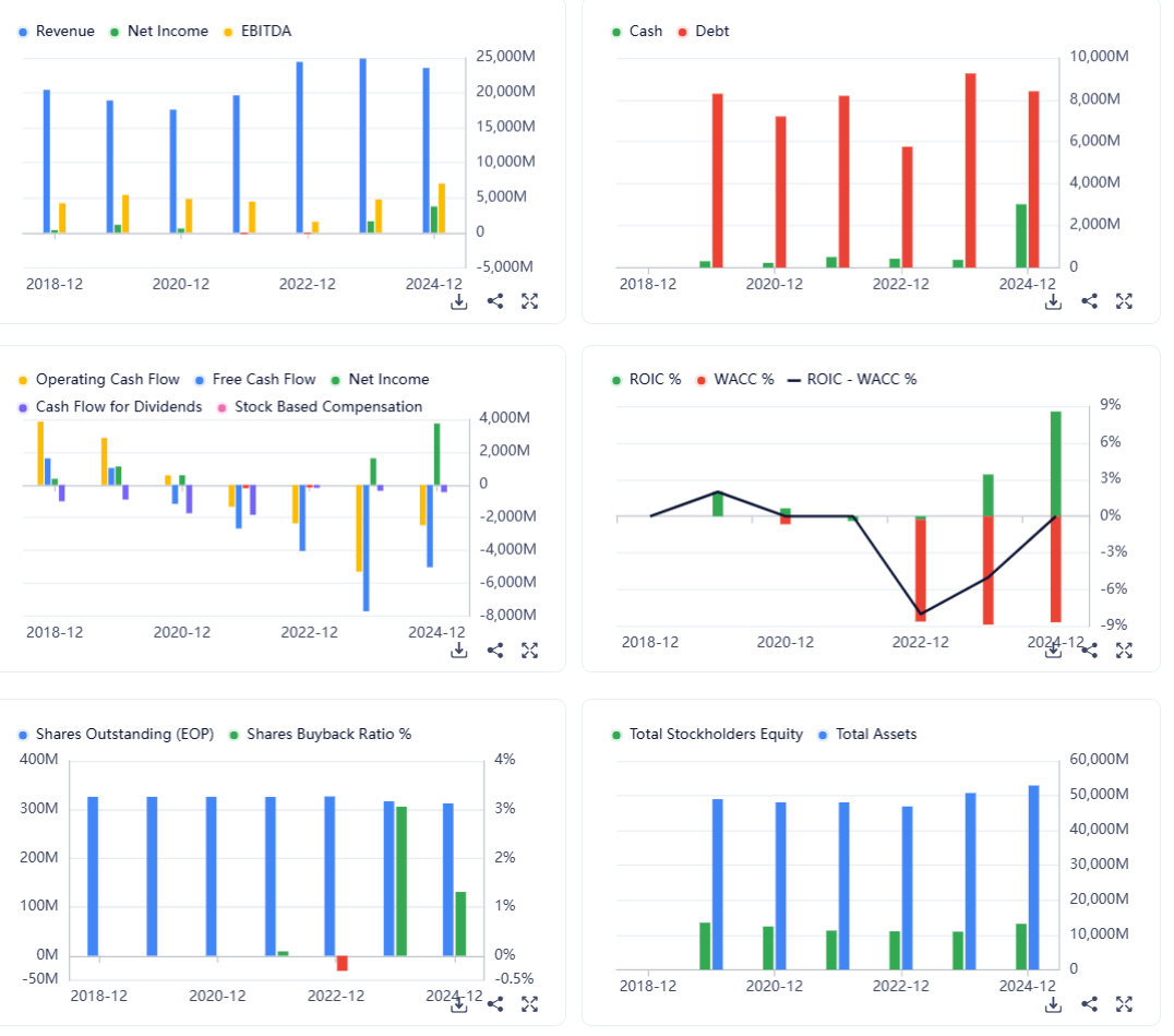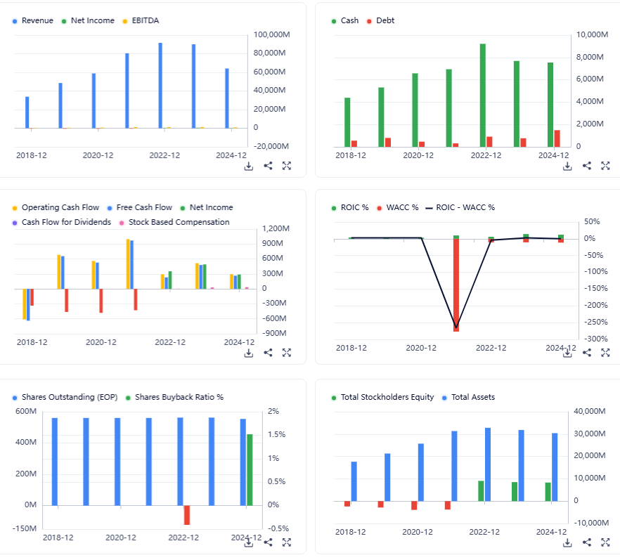 20250513: 安森美半导体(ON)。标普500成分。今天在 WSJ 上的《美中关税摩擦缓和,这十只科技股可能受益最大》网页链接 看到这只股票,大概是说安森美收入比较国际化,应该会受益于GS和解。这文章来自MarketWatch,我觉得看看就好。我在24年3月研究韦尔的时候 网页链接,看过安森美,当前市值 315亿。现在已经 186亿了,不知道是恐惧错杀,还是产品不行了。留张财务图。市盈率(TTM):29.42 市净率:2.32 52周最低:31.04 委比:-50.00% 市盈率(静):11.86 市销率:2.80 每股收益:1.52 股息(TTM):-- 每手股数:1 总市值:186.46亿 每股净资产:19.22 股息率(TTM):-- . + . 美股里面难得看到负债表这么有纪律的企业。