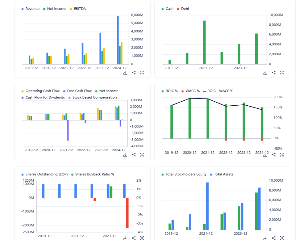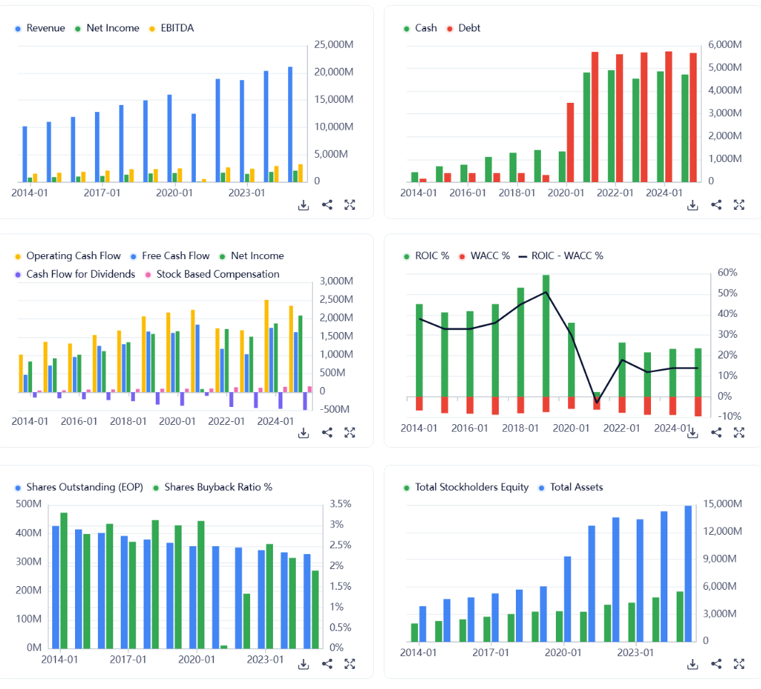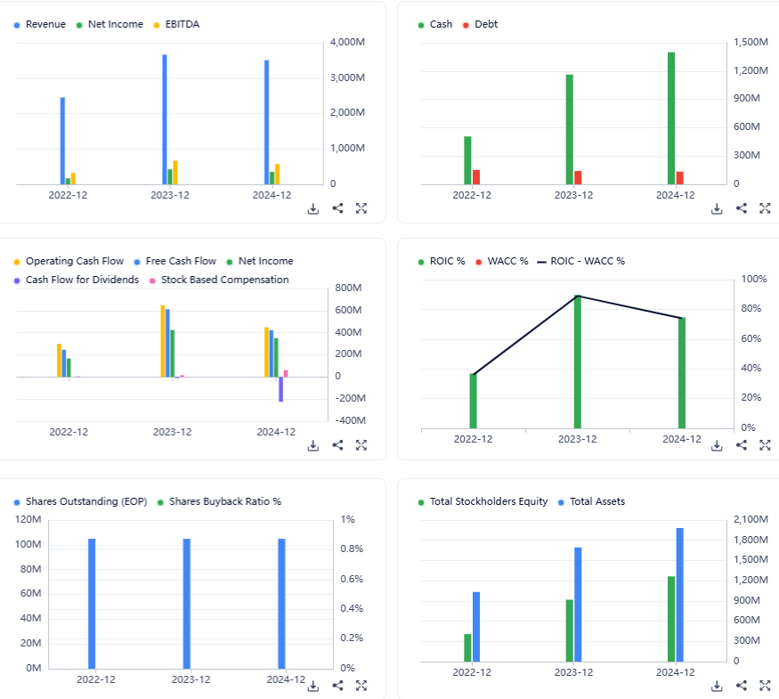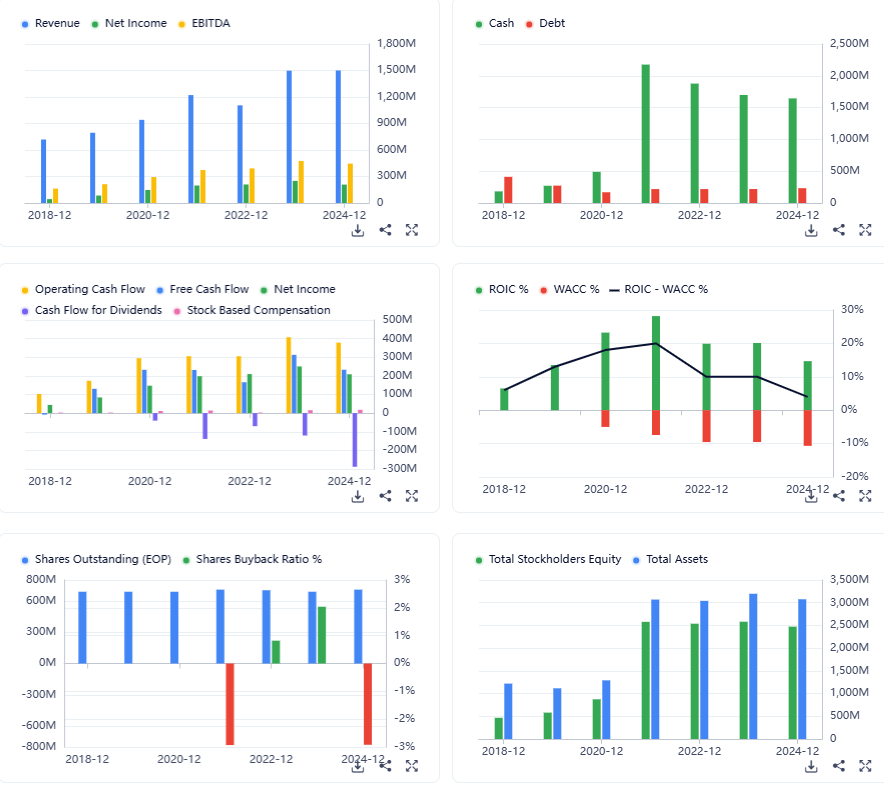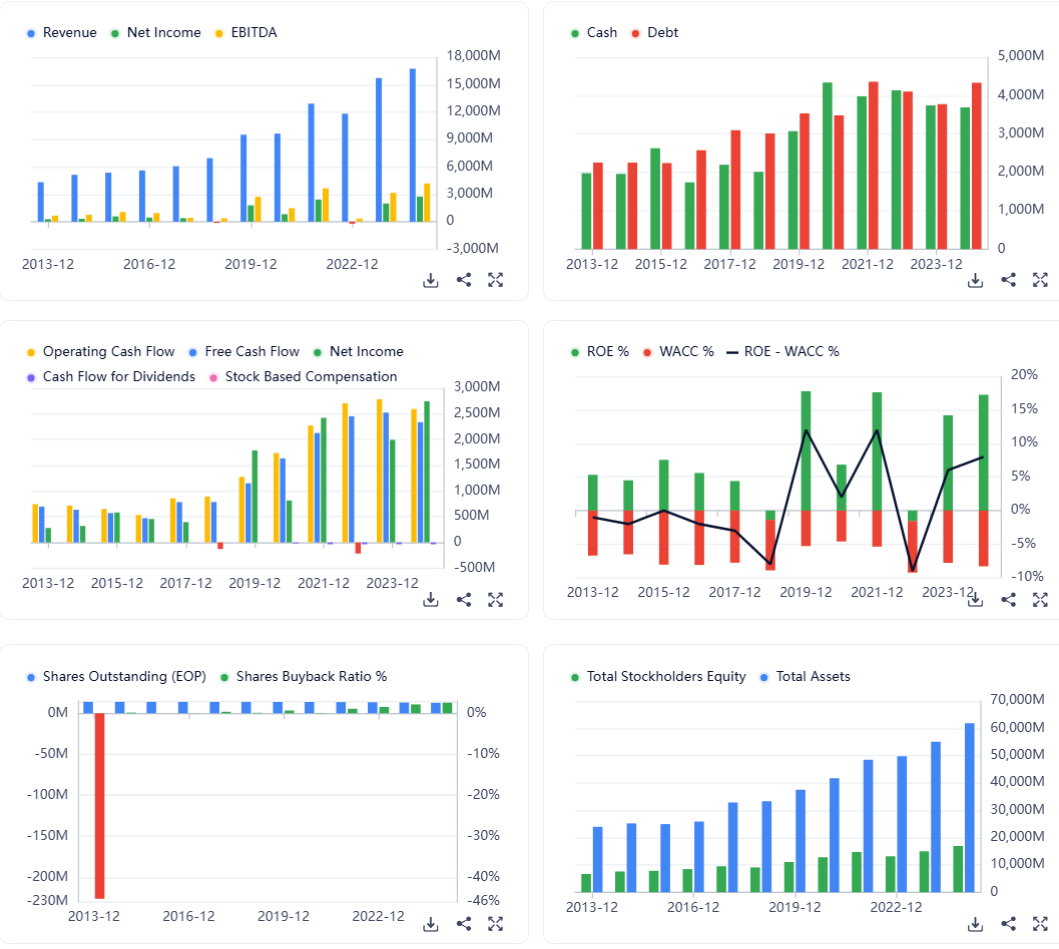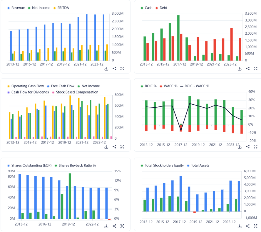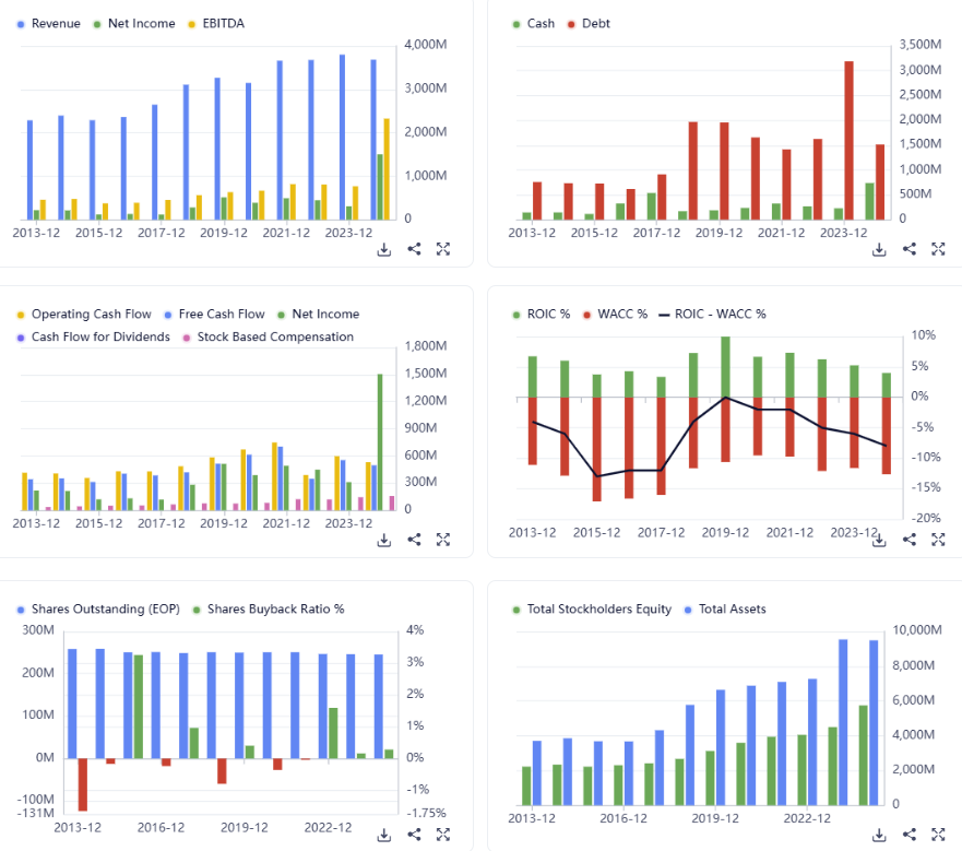 20250511: 天宝导航(TRMB)。我在问DS标普里面哪些中型股收益于AI,它给了我这个标的,不知道是哪个网页里面打听来的。看了看财务,觉得这是一家很不错的公司,但是是不是高估就不知道了。市盈率(TTM):10.73 市净率:3.00 52周最低:48.65 委比:0.00% 市盈率(静):10.80 市销率:4.55 每股收益:6.35 股息(TTM):-- 每手股数:1 总市值:162.52亿 每股净资产:22.05 股息率(TTM):-- 。-+. 24年的低市盈率来自非经常收益。120亿肯定是值的,没有多少安全边际了,有时候看年报的话,倒是可以继续研究。