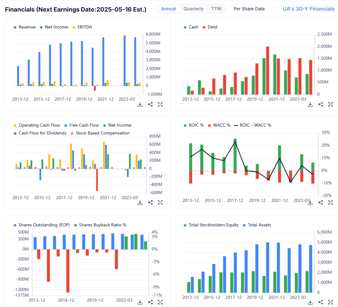 20250503: 安德玛C股(UA)。今天在看 Prem Watsa 的持仓(网页链接)时,发现他在去年二季度开始建仓 UA。创始人在去年4月份就已经回归 CEO 了。现在想要减少打折的天数,挽回品牌形象。我还是不太敢看好。这支股票我买过。我只是觉得这个牌子的形象很不错。2016年 175亿市值的时候第一次看 网页链接,后来一路看,一路下跌。这种没有护城河的生意真是没意思,那个时候很多厉害的基金就看上了微软,然后就是翻倍再翻倍。2017年安德玛开始跌的时候,我就去抄底,结果到年底发现只是抄在了半山腰,年底市值 63亿 网页链接。23年底再看的时候 36亿 网页链接,现在才 24.4 亿。不过其财务算不上危险,几乎没有利息负担,且还有钱回购。现在这个阶段去买,反倒亏面很小。实盘要考虑考虑,这种消费品牌的趋势很难预测。市盈率(TTM):亏损 市净率:1.23 52周最低:4.62 委比:0.00% 市盈率(静):10.50 市销率:0.47 每股收益:-0.30 股息(TTM):-- 每手股数:1 总市值:24.37亿 每股净资产:4.62 股息率(TTM):-- 。我看了一下天猫和亚马逊的商品,感觉评价都还行,就是东西觉得还是丑了点。