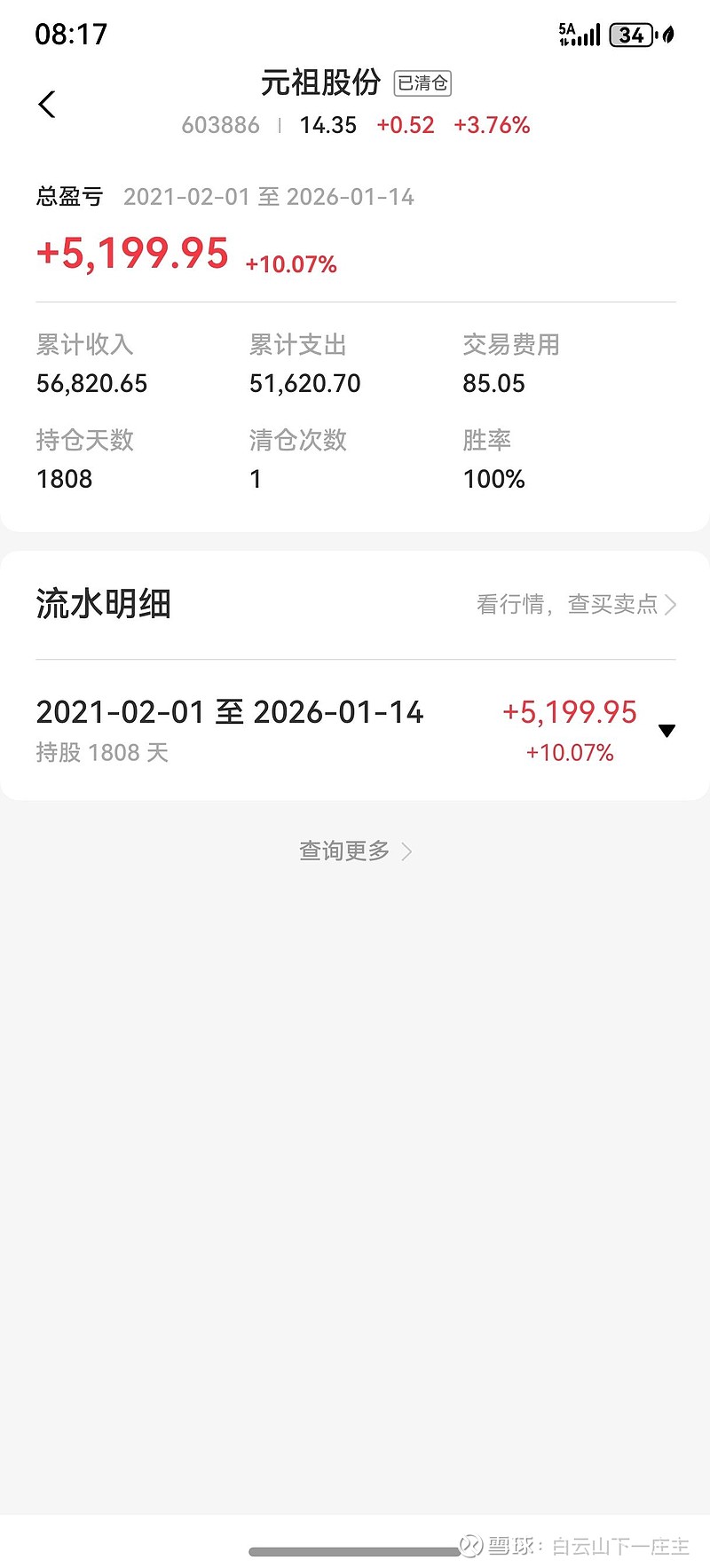 $元祖股份(SH603886)$ 陪跑了1808天,最终还时清仓离场。五年下来累计分红收入:7300,卖出股票的价差亏了2100.05元。这是人生买入的第一支股票,当时看中的就是商业模式简单能看懂、财报清晰、分红率高。选择清仓的原因主要两点: