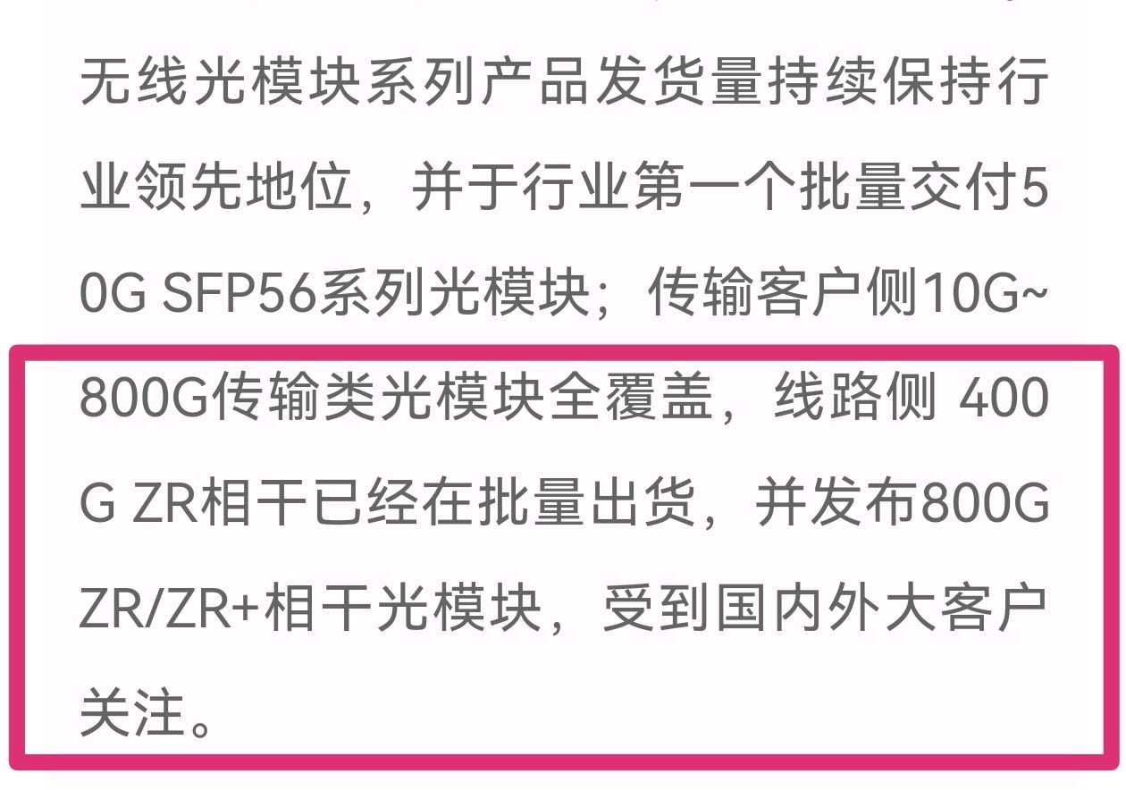 华工科技在2024年11月的回复,他是唯一已经批量出货相干光模块的厂商,而且已经发布有800G的产品!新易盛还在研发。