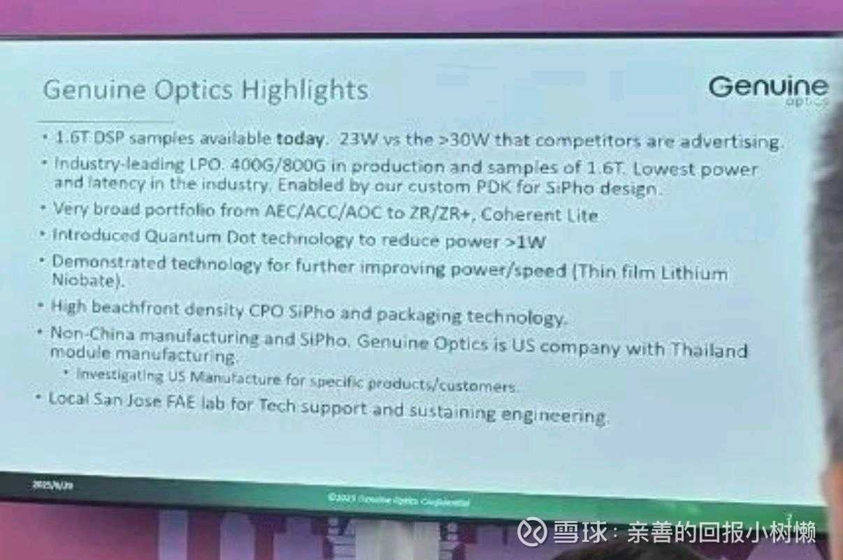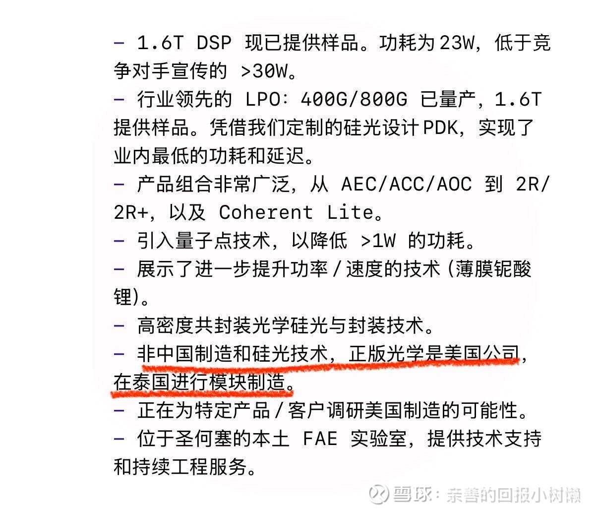 翻译就是:1.6T,由华工的美国公司生产(正版光学是美国注册成立的公司);非中国制造,泰国工厂制造;采用华工科技的硅光技术;能耗全球最低;最大程度帮助北美和欧洲数据中心省电;有可能为头部厂商制定北美本土工厂制造计划!