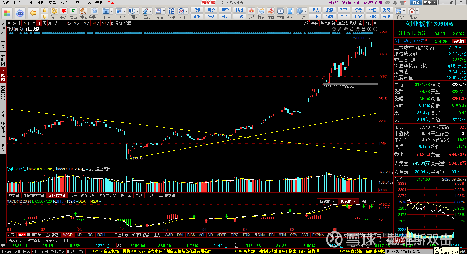 (3) $创业板指(SZ399006)$ :近期走势最强的指数今天出了一根阴线。目前不好定性,观察点是周二的低点,如果跌破技术上宣布短期调整趋势确立。