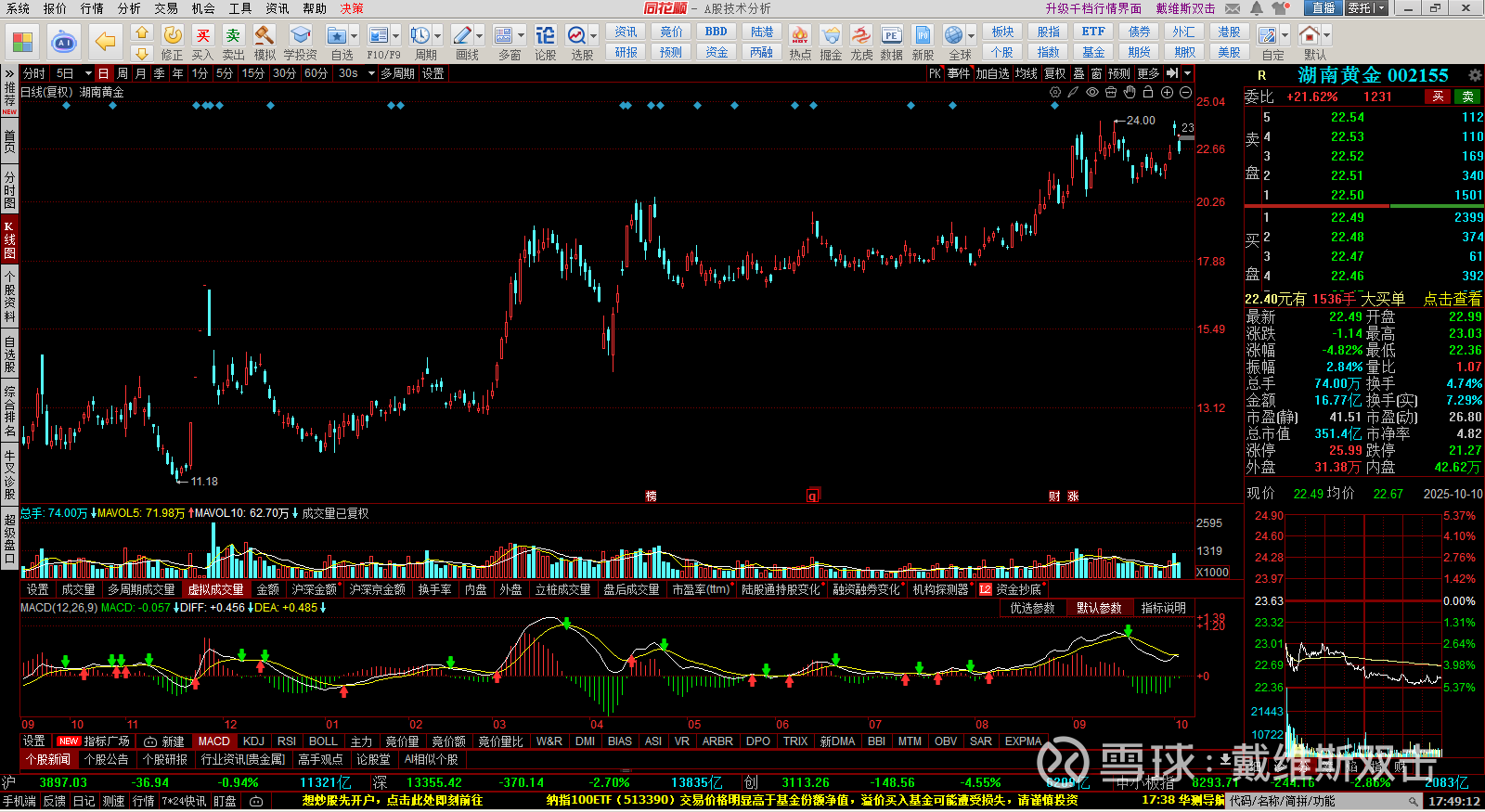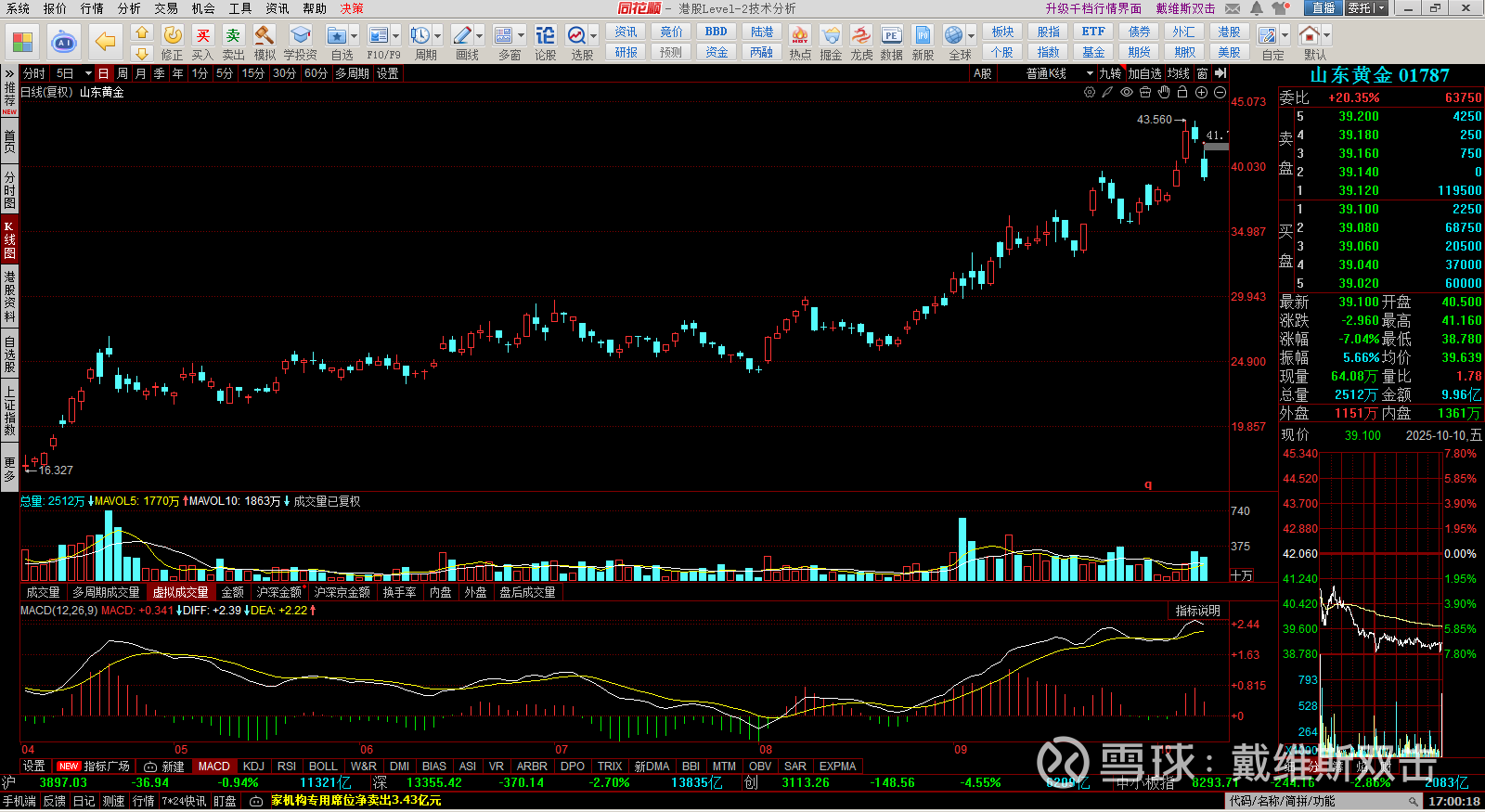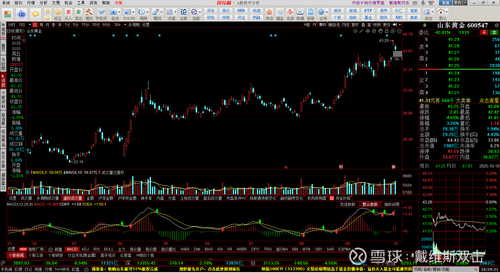 (2) 山东黄金:隔离线走势,风险开始暴露,这个位置上短线不宜再入,可以考虑减仓。