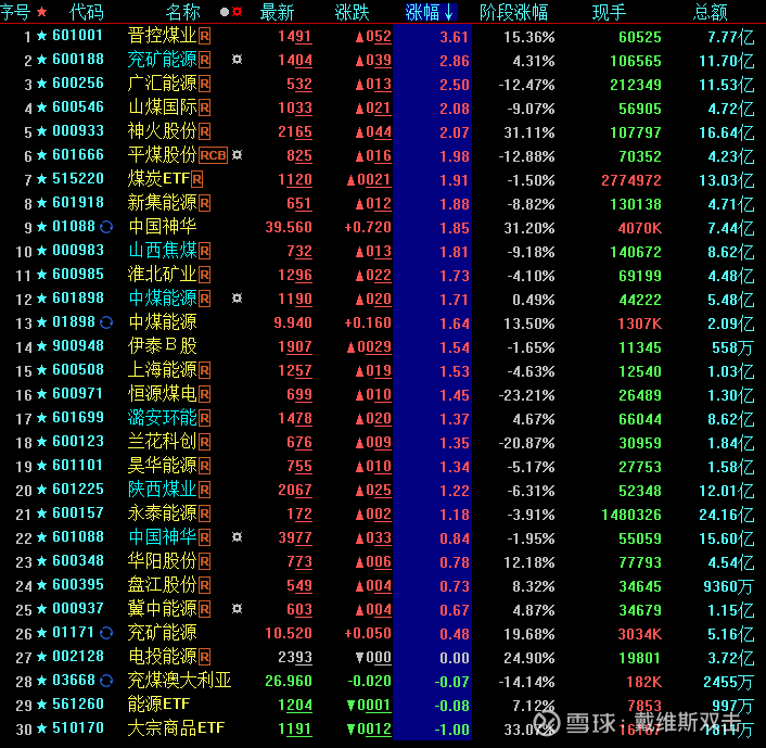 (1) 整个牛市前期滞涨的行业板块,今天齐刷刷的站上涨幅榜,典型的就是煤炭。