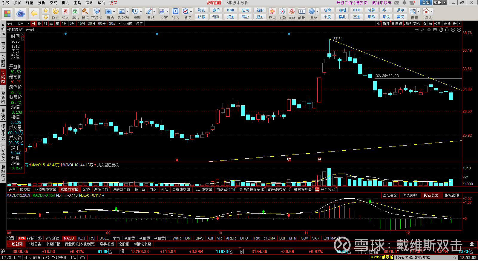 (2) 云天化:清仓,11/20日 32.79元卖出1/3后买入光刻胶股,昨天30.73元卖出剩余2/3,从今天看正确。失误之处在于11/20日就应该全仓换入光刻胶股票,执行力还是不够坚决。