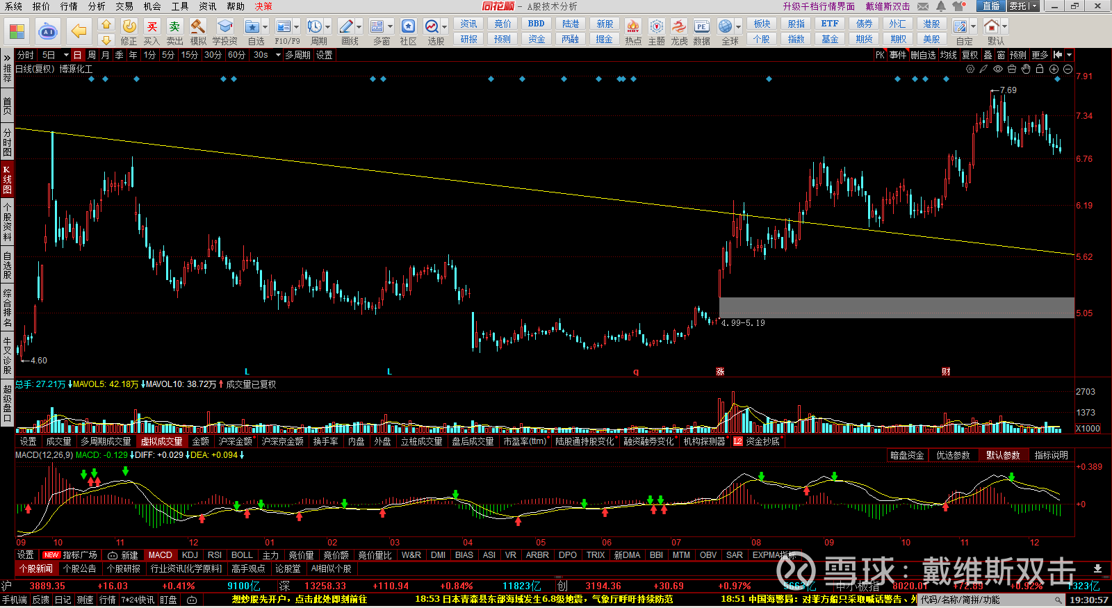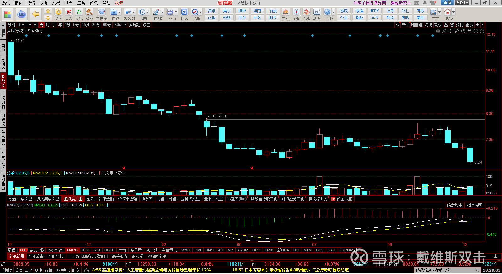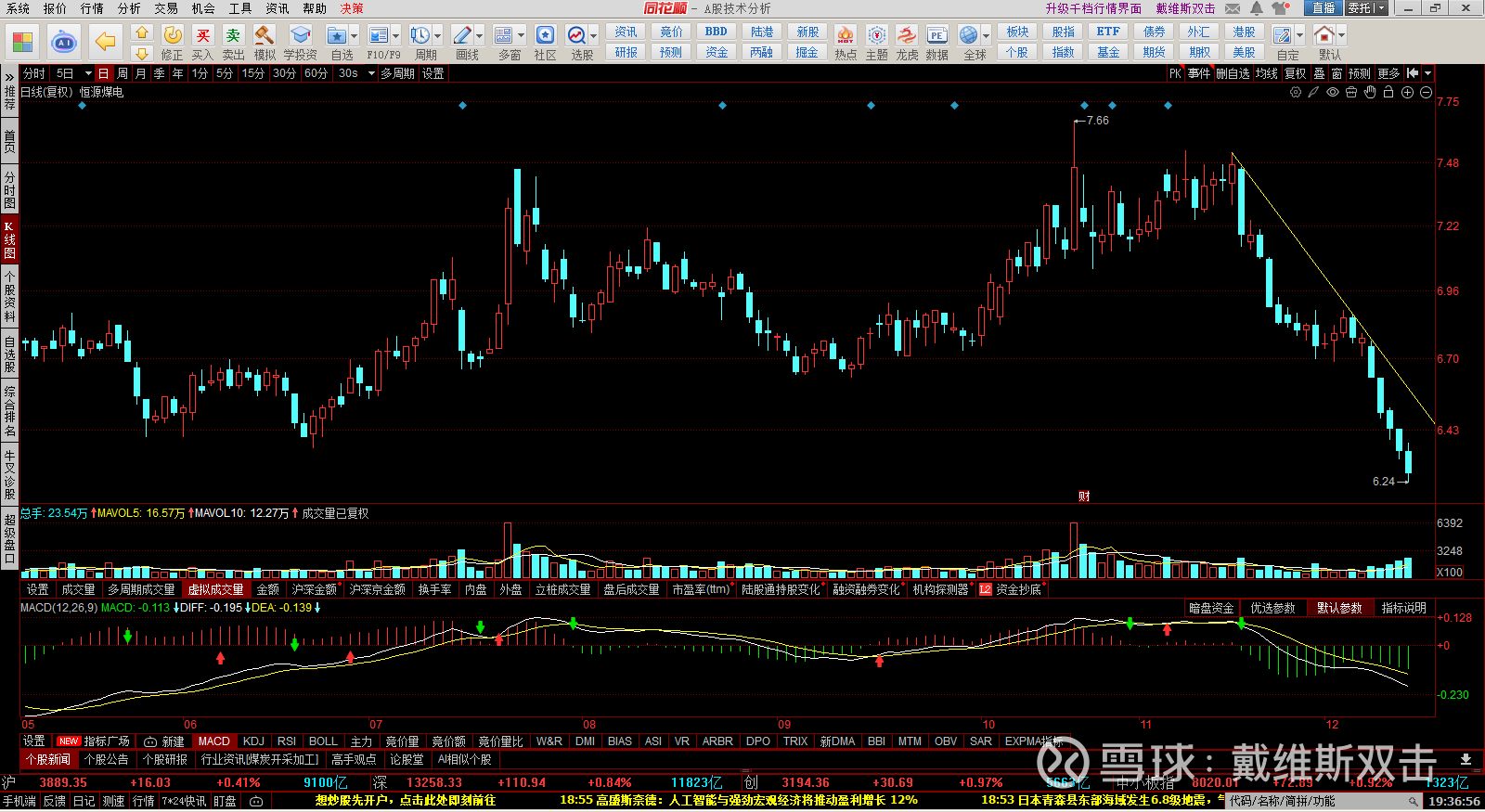 (1) 恒源煤电:日K线上,MACD属于一字断魂刀走势,加速赶底形态。短线或许有技术性反弹。