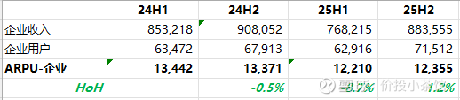2. 企业付费用户数量按年增长,全年企端ARPU仍然下降,但25H2看到了小幅改善。尽管企端ARPU按年仍然大幅下降(这也体现在企业客户数量同比增加但合同负债出现同比小幅下降),但如果简单粗暴的把企业收入拆成半年度来看(不够准确,只能算是个模糊的快照),那么,过去四个半年度的企业数量及付费情况如下: