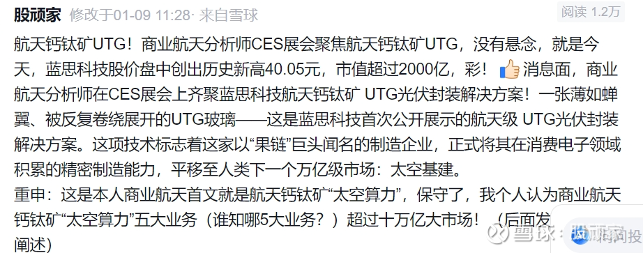 1,航天钙钛矿UTG!商业航天分析师CES展会聚焦航天钙钛矿UTG,没有悬念,就是今天,蓝思科技股价盘中创出历史新高40.05元,市值超过2000亿,彩!