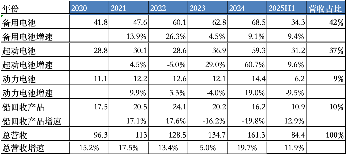 3)动力电池(7.3%营收):叉车、高尔夫球车等场景,逐步拓展锂电产品(安徽、越南产线)。