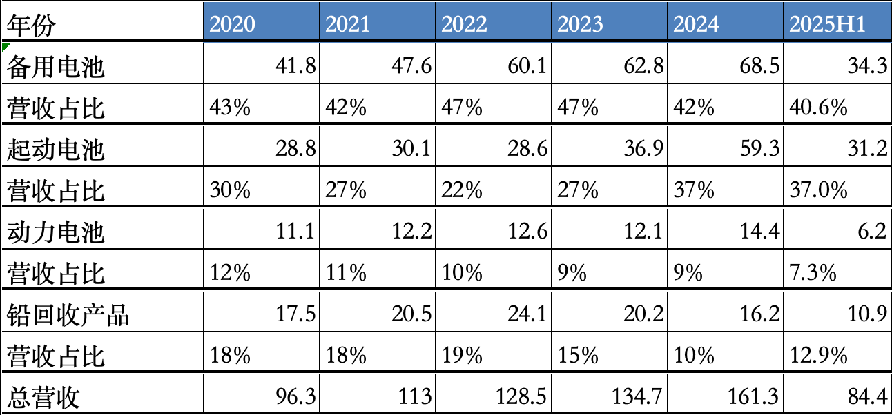 1)备用电池(40.6%营收):公司最大的营收来源,主要为各类数据中心、通信基站、电力系统提供备用电源UPS。客户包括亚马逊、京东、中国移动等。