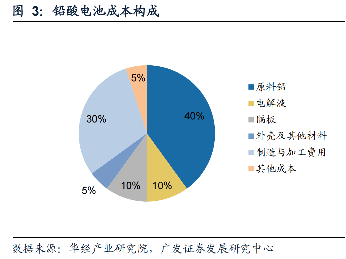 在成本构成中,原料铅在铅酸蓄电池原材料成本中所占比例约为60%,在整体制造成本中所占比例为40%左右,为铅酸电池最大成本项,因此铅酸蓄电池价格受原料铅价格影响较大。此外,加工制造费用在总体制造成本中所占比例约为30%。