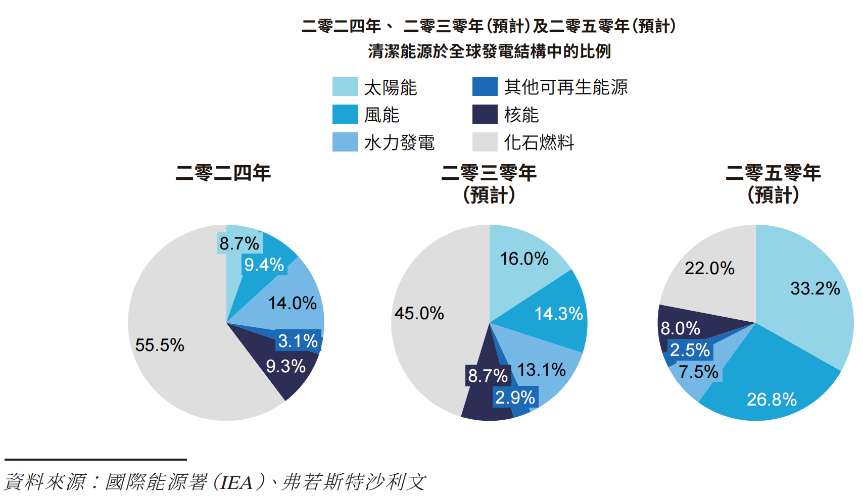 随着能源结构向太阳能及风能加快转型及可再生能源技术的不断发展,预计2030至2050年可再生能源发电于全球发电结构中的市场份额将分别达到超过45%及约70%。